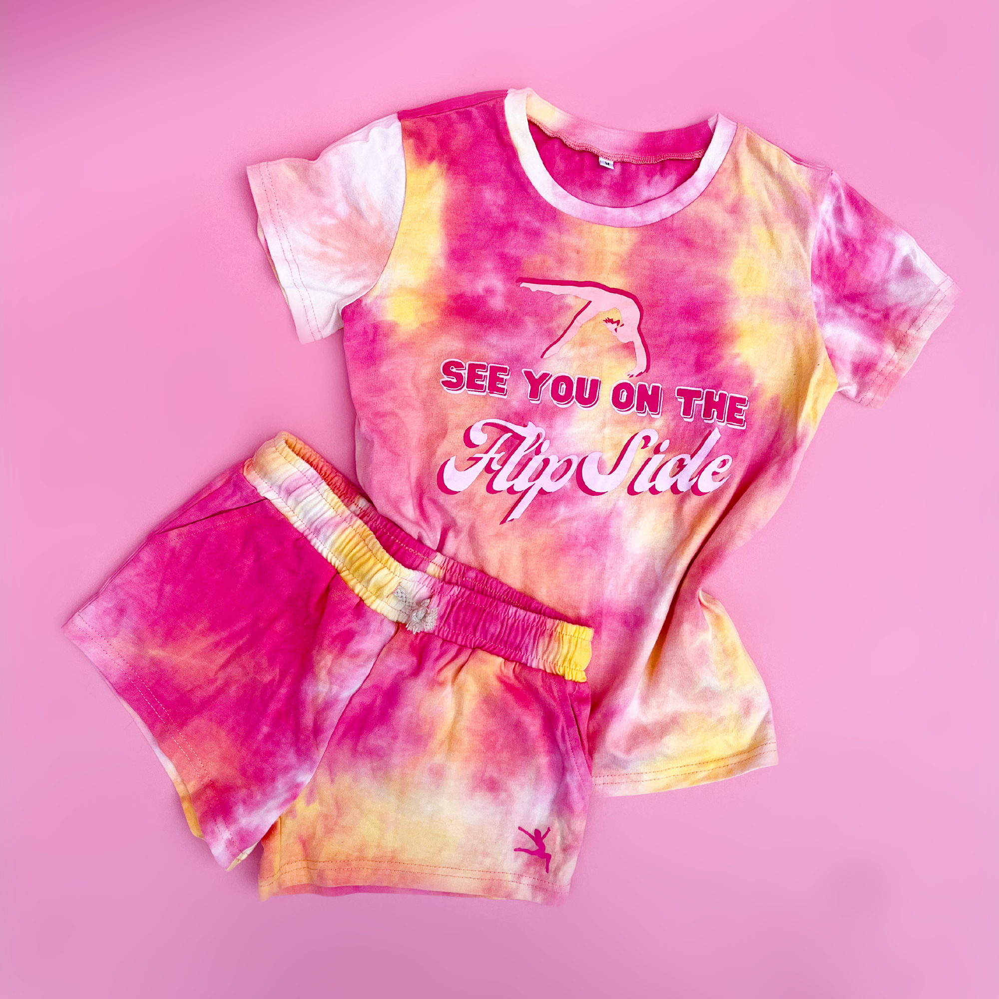This Summer Tie Dye Lounge Set will be perfect for your gymnast during the warm summer days! Great for before/after practice or just as everyday wear. Get your gymnast one of our lightweight, breathable, quick dry, anti-pilling TIE DYE sets today!