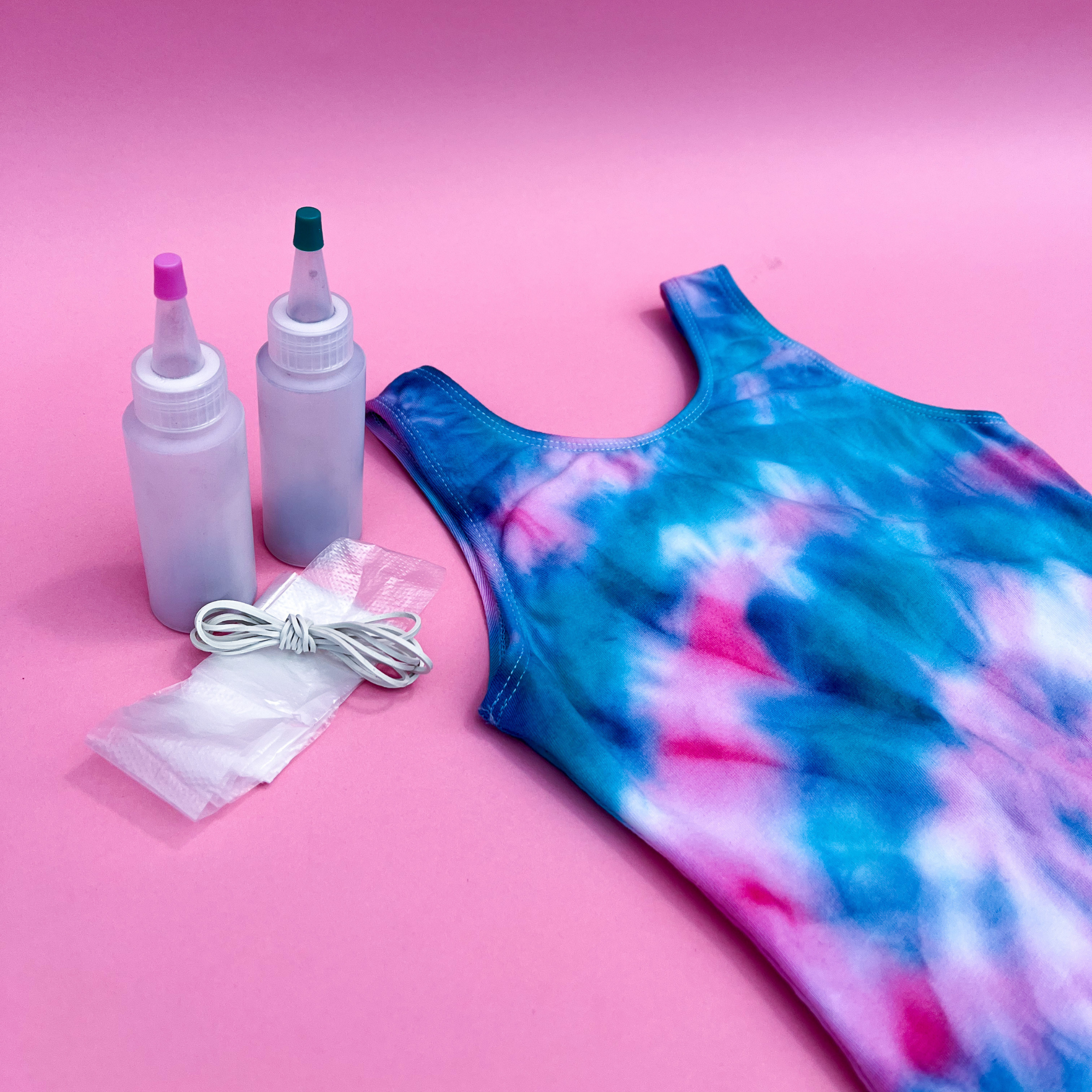 Who doesn't love tie dye?! Now you can spend a day tie dying your very own leotard! With our Dye Leotard Kit you will be able to create your very own design and show it off at your next practice. Colors included: pink & turquoise or pink & purple. We recommend dumping the dye out on a paper plate and starting with a pinch of dye - add more until you achieve your desired colors! Examples of pink and purple grip bag below show just a pinch of each color to the full amount of dye - achieve these or anything between!
