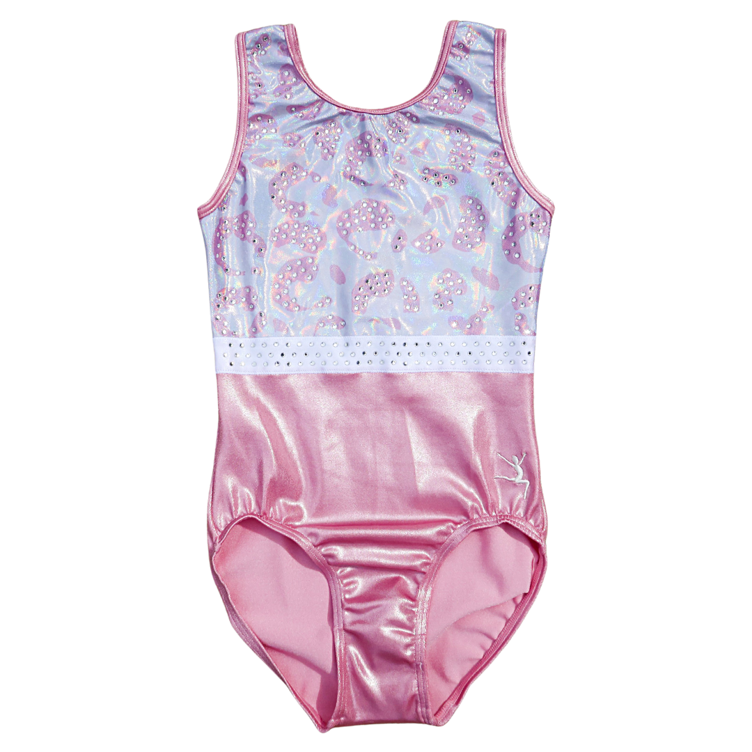 With a rhinestone belt, bias trim and moisture wicking fabric this leotard is great for your gymnast! It also has a leopard print on the top half with rhinestones and a plain shimmer on the bottom half. Watch your gymnast go to practice feeling cute and confident!